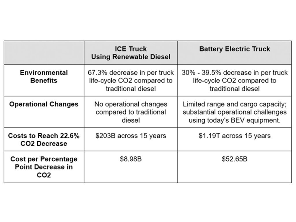 The above table is an excerpt from a recent American Transportation Research Institute (ATRI) study. The study proves an internal combustion engine (ICE) using renewal diesel has fewer carbon emission than traditional diesel, 67.3% fewer, whereas a battery electric truck doesn’t fair as well with only a 30% – 39.5% reduction in carbon emissions.