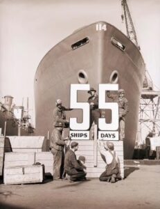 The above photo was taken in 1943 and celebrates a California shipyard’s 5th ship in five days. Our wartime shipbuilding prowess was a force to be reckoned with. That was a long time ago, but folks are looking to reclaim those glory days.